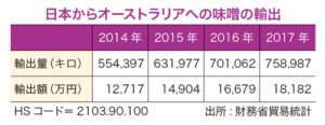 日本の財務省貿易輸出統計によると、2017年の味噌のオーストラリア向け輸出実績は、量ベースで約759トンと、2014年から約36.9%増加、金額ベースでは約1億8千万円と、約43.0%増加と、順調に伸びています。