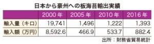 最新の財務省貿易統計によると、2016年に日本からオーストラリアに向けて輸出された板海苔の輸出量は1,393キロ、輸出額は882万4,000円となっています。