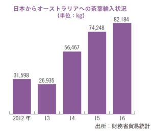 日本の財務省貿易統計によると、日本からオーストラリアへの茶葉の輸入状況は2012年から2016年の間に31,598キログラムから82,184キログラムへと約2.6倍増加しており、緑茶人気の高まりとともに非常に好調に推移しています。