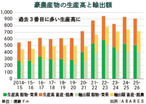 オーストラリア農業資源経済・科学局(ABARES)は3日、2025/26年度(新年度:25年7月-26年6月)の農産物生産高が前年度比2.8%減の907億豪ドル(1豪ドル=約93円)に達するとの見通しを発表した。林業と水 […]