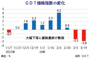 【酪農】乳製品価格GDT指数、2.8%上昇(OTH) 乳製品の価格指標グローバル・デアリー・トレード(GDT)価格指数は2日の競売で、前回から2.8%上昇した。2回続落後の反発。生産者乳価に影響する全脂粉乳は3.4%上昇 […]