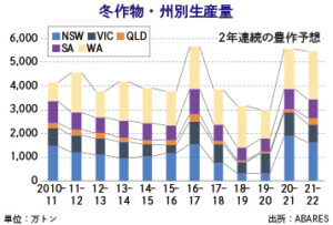 オーストラリア農業資源経済・科学局(ABARES)は8日、最新の穀物リポートを発表し、2021/22年度(21年7月―22年6月)の冬作物の生産量は5,480万トンで、昨年に続き5,000万トンを超える豊作と予想した。