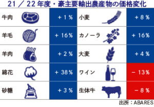 オーストラリア農業資源経済・科学局(ABARES)は14日、2021/22年度(21年7月~22年6月)の農業生産高が730億豪ドル(1豪ドル=約80円)で、過去最高額に達するとの見通しを発表した。