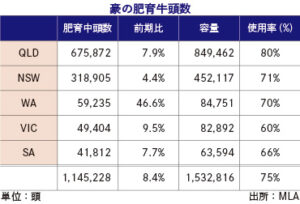 EYCIは現在、6豪ドル台が目前になった状態だ。今月1日の価格は7.05豪ドル(枝肉1キログラム当たり、1豪ドル=約91円)を付け、1年前から38%下落。直近の1カ月でも8%下落した状況だ。