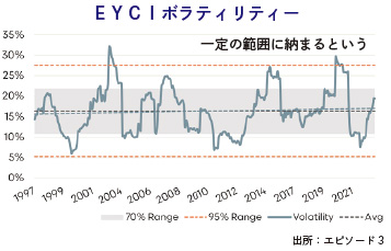 エピソード3は、1997年以降のEYCIの毎月の価格変動を基に年間のボラティリティーを算出した。この結果、ボラティリティーの幅は下限5%、上限30%の間に収まり、長期平均は16%、正常な変動幅は11%-22%だった。ボラティリティーが5%未満、または27%を超えるケースは非常にまれで、97年以降、この水準を超えた期間は全体のわずか5%にとどまったという。