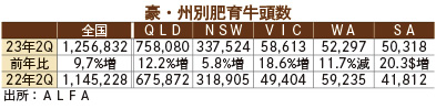 豪の肥育牛数、9%増で過去2番目の多さ 2023年8月17日 最終更新日時 : 2023年8月17日 ウェルス編集部 オーストラリアの2023年第2四半期(4-6月)の穀物肥育牛頭数が前期から8.5%増加し、125万6,832頭となったことが、オーストラリア食肉家畜生産者事業団(MLA)と業界団体オーストラリア・ロットフィーダーズ協会(ALFA)の調査で分かった。過去2番目に多い頭数だ。 コンテンツの残りを閲覧するにはログインが必要です。 お願い Log In. あなたは会員ですか ? 会員についてFacebookXBluesky