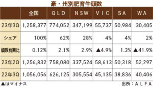 豪の穀物肥育牛数、需要強く16%増 2023年11月23日 最終更新日時 : 2023年11月23日 ウェルス編集部 オーストラリアの2023年第3四半期(7-9月)の穀物肥育牛の頭数が125万8,377頭で、前年同期から16%増加したことが、オーストラリア食肉家畜生産者事業団(MLA)と業界団体オーストラリア・ロットフィーダーズ協会(ALFA)の調査で分かった。強い需要を示しているという。 コンテンツの残りを閲覧するにはログインが必要です。 お願い Log In. あなたは会員ですか ? 会員についてFacebookXBluesky