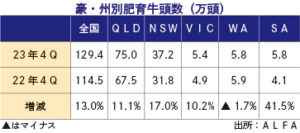 豪の牛群、11万頭超減少へ 牛肉生産・輸出は増加継続 2024年2月29日 最終更新日時 : 2024年2月29日 ウェルス編集部 オーストラリアで3年続いた牛群の拡大が停止し、今年から縮小局面に入る見込みだ。オーストラリア食肉家畜生産者事業団(MLA)がこのほど発表した業界予想によると、2024年6月の牛群数は2,860万頭と、過去10年間の最大水準に達した前年から11万5,000頭減少する。一方で牛の解体処理頭数や牛肉生産量は今後も増加し、競合する米国の供給が減る国際市場においてオーストラリアの存在感はより高まるという。【ウェルス編集部】 コンテンツの残りを閲覧するにはログインが必要です。 お願い Log In. あなたは会員ですか ? 会員についてFacebookXBluesky