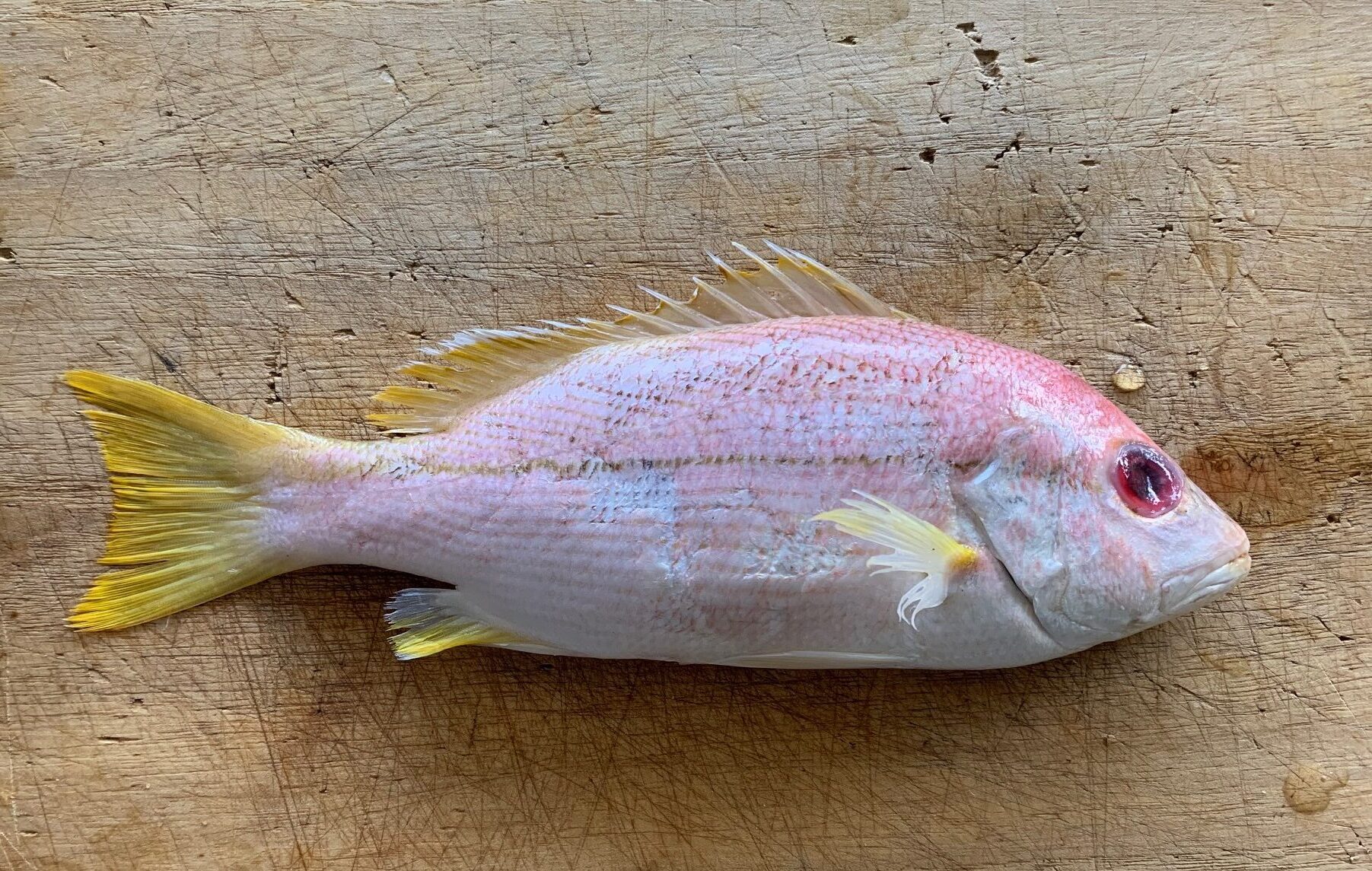 3月上旬に色鮮やかな魚が市場で目に止まりました。背ビレや尾ヒレなどが黄色く、全体に赤みがかっています。これはフエダイの一種で、日本市場には出回らない「タテフエダイ」とみられます。
