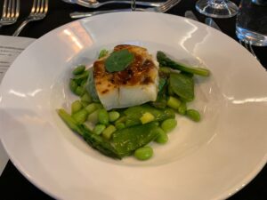 メイン料理の一つとして提供された「銀ムツの長野県産白味噌マリネと黒ニンニク夏野菜」