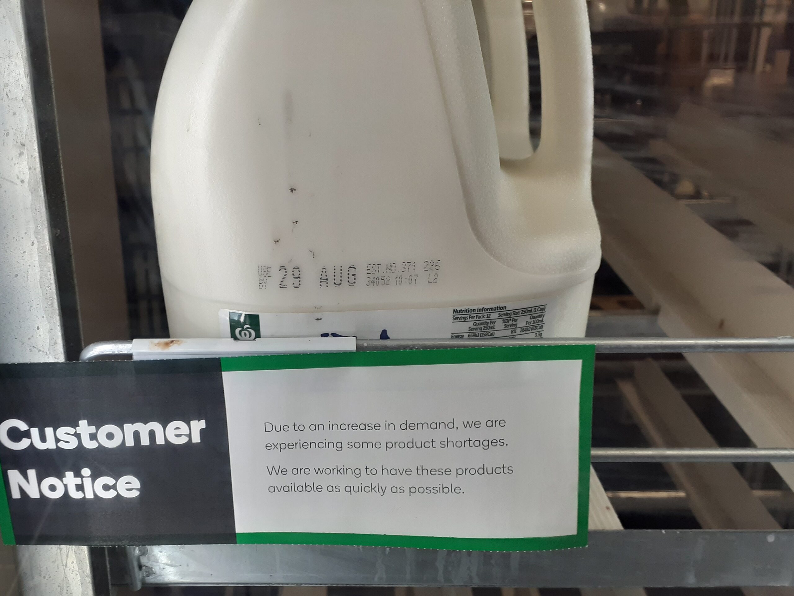牛乳の需要が強く、仕入れが間に合わないと謝罪するシドニーのスーパー