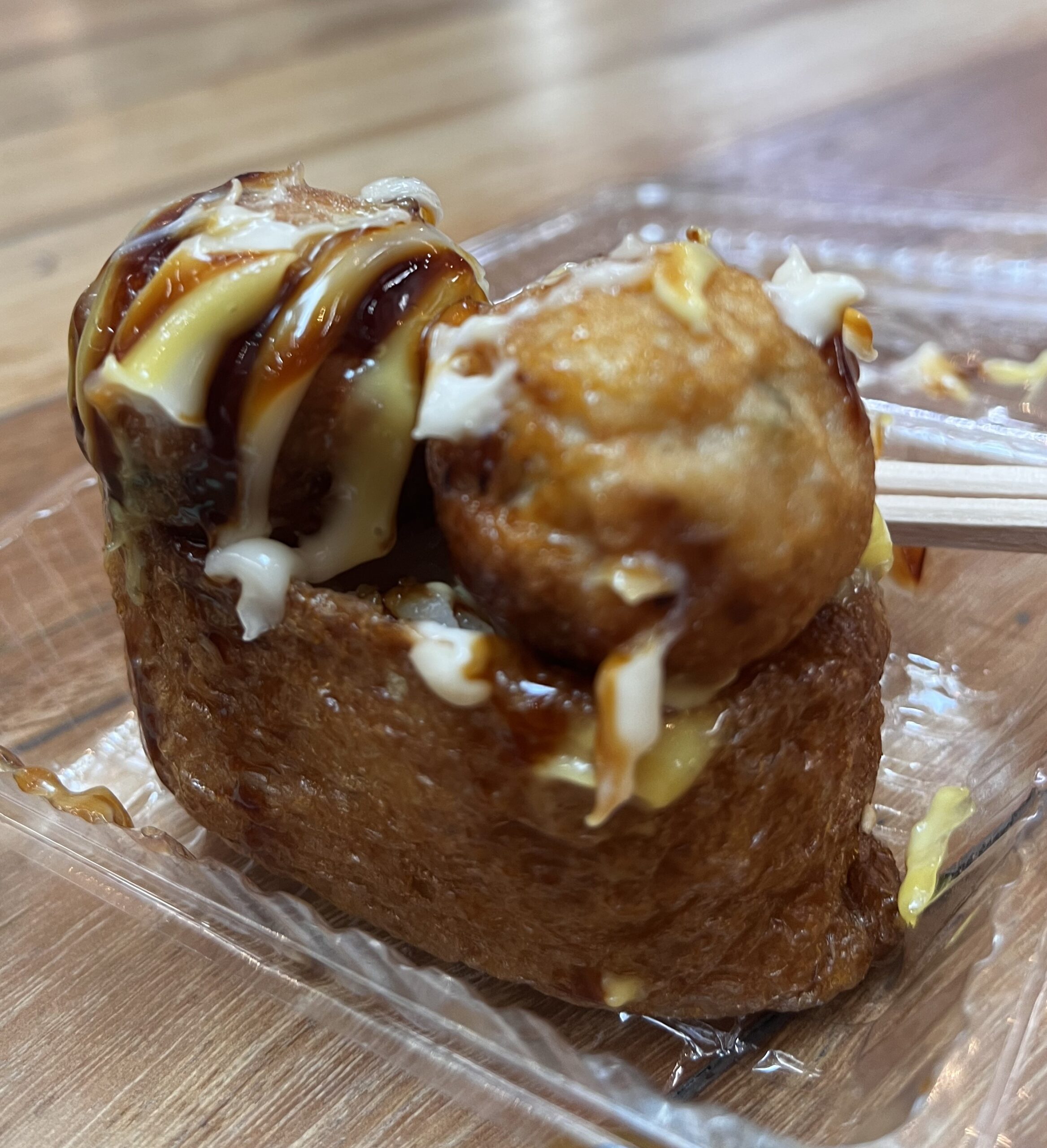 これを聞き、「ザ・海外版寿司」を食べたくなった筆者は、偶然にフードコートで「たこ焼きいなり寿司」を見つけ、食べてみた。いなり寿司の上にたこ焼きが乗っているにすぎない。だが、トロトロのたこ焼きといなり寿司の油揚げが思いのほかマッチしており、想像より違和感がなかった。ソースも醤油もかけるのは受け入れがたく、別々で食べたい。そのたこ焼きいなり寿司は最後の1個だったようで、オージーに人気のようだ。