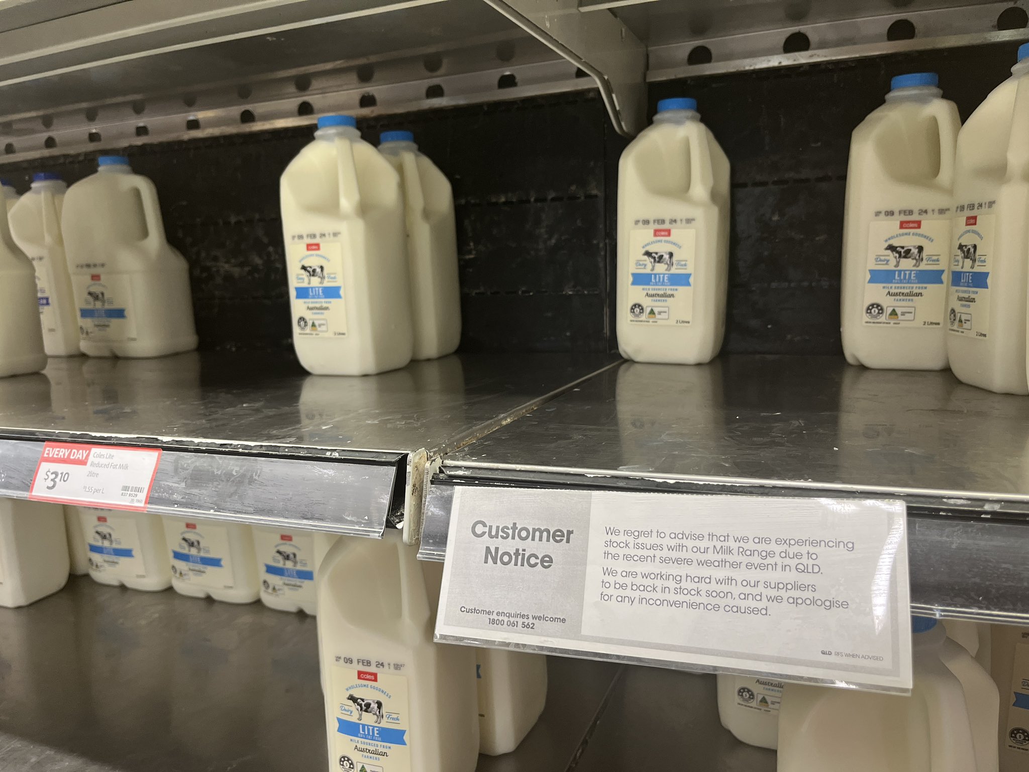 QLD州の荒天で供給網が混乱していると通知するスーパーの牛乳売り場(シドニー市内)