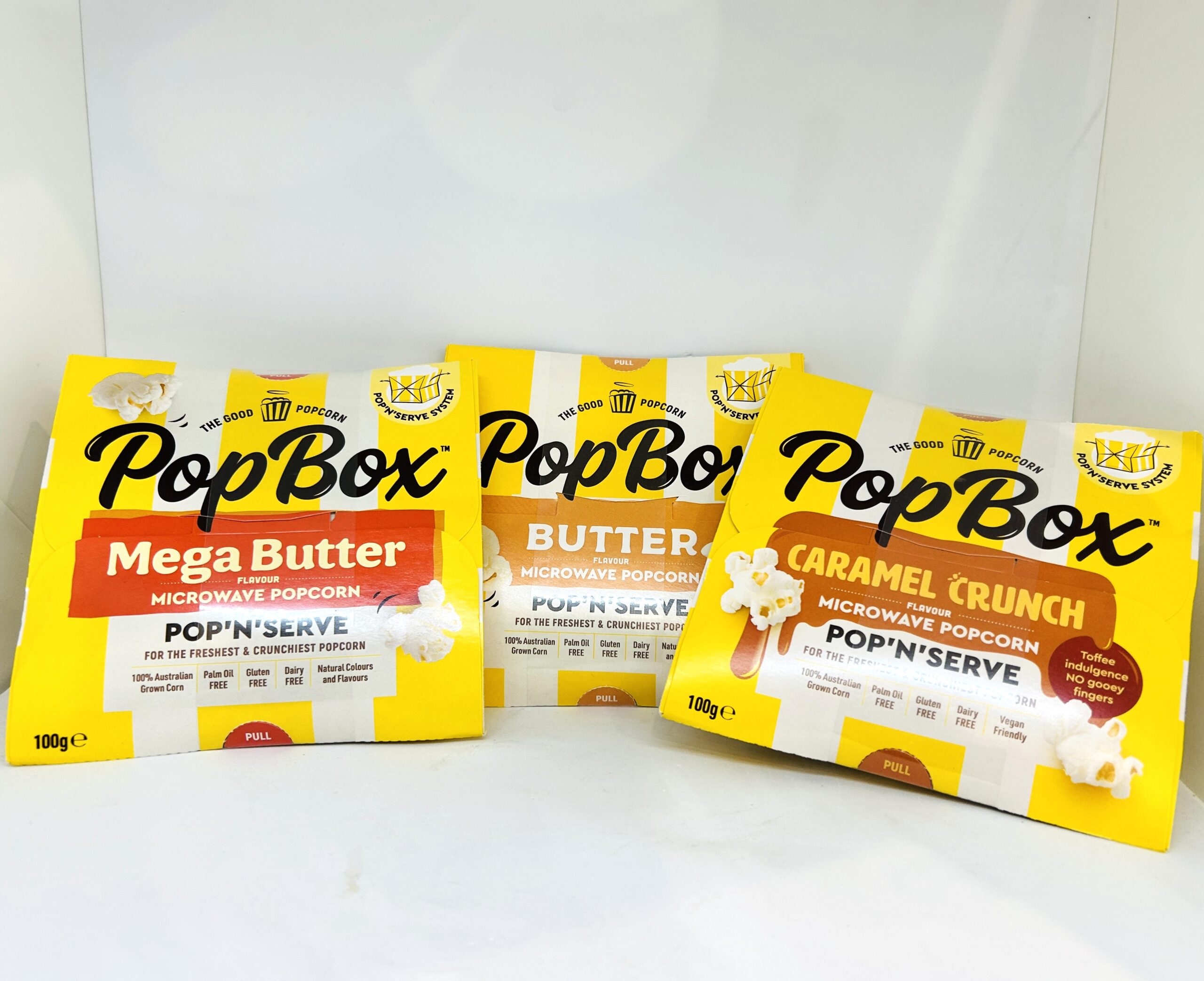 ポップボックスはオーストラリア産のトウモロコシを100%使用したポップコーンです。箱のまま電子レンジに入れて2ー3分加熱するだけで出来上がる手軽さに加え、箱型なので中身を器に移すなどの手間なく食卓にそのまま提供できるようになっています。