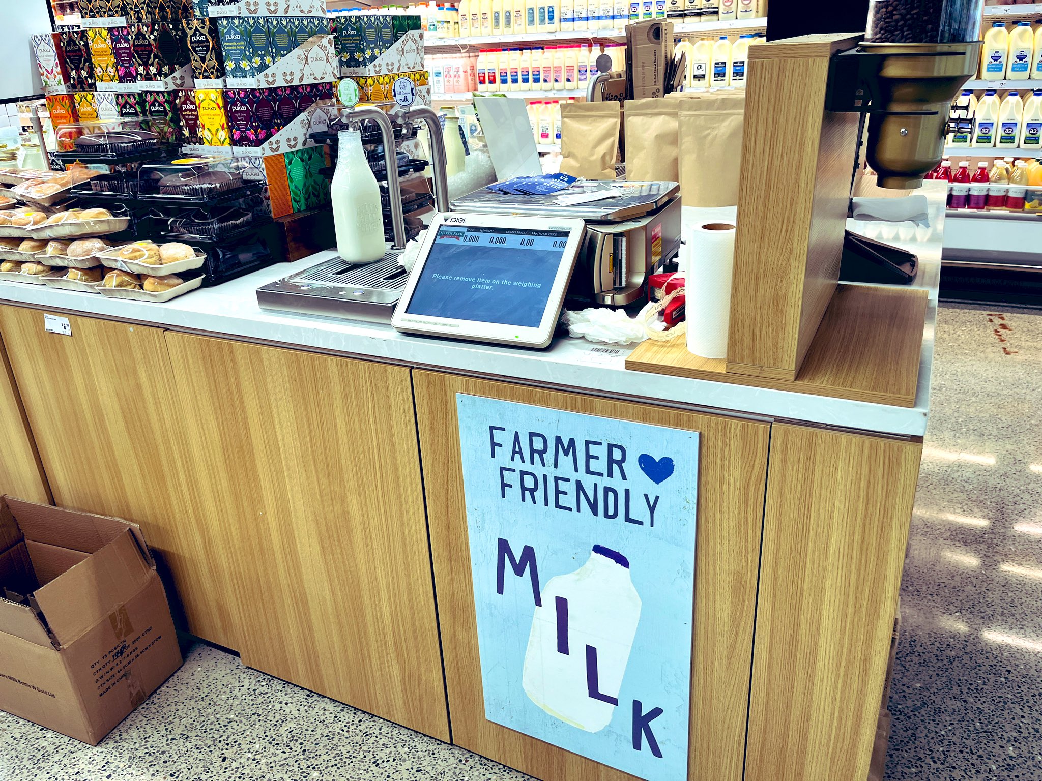 シドニーのスーパー、ハリスファームに牛乳の量り売りが登場(NNA撮影)