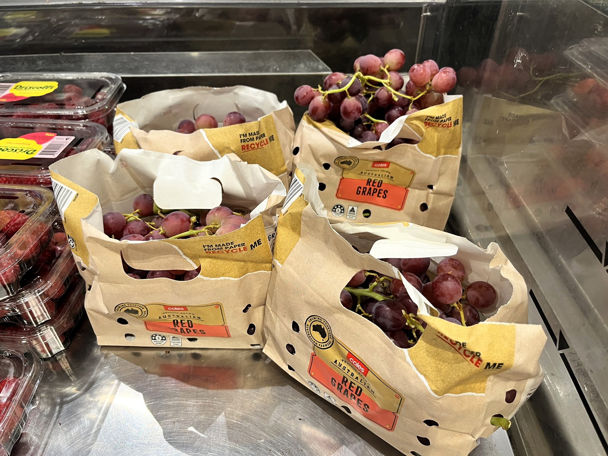 豪の食品小売業界でプラ容器の切り替えが進む。コールズでもブドウの袋が紙に(シドニー市内)