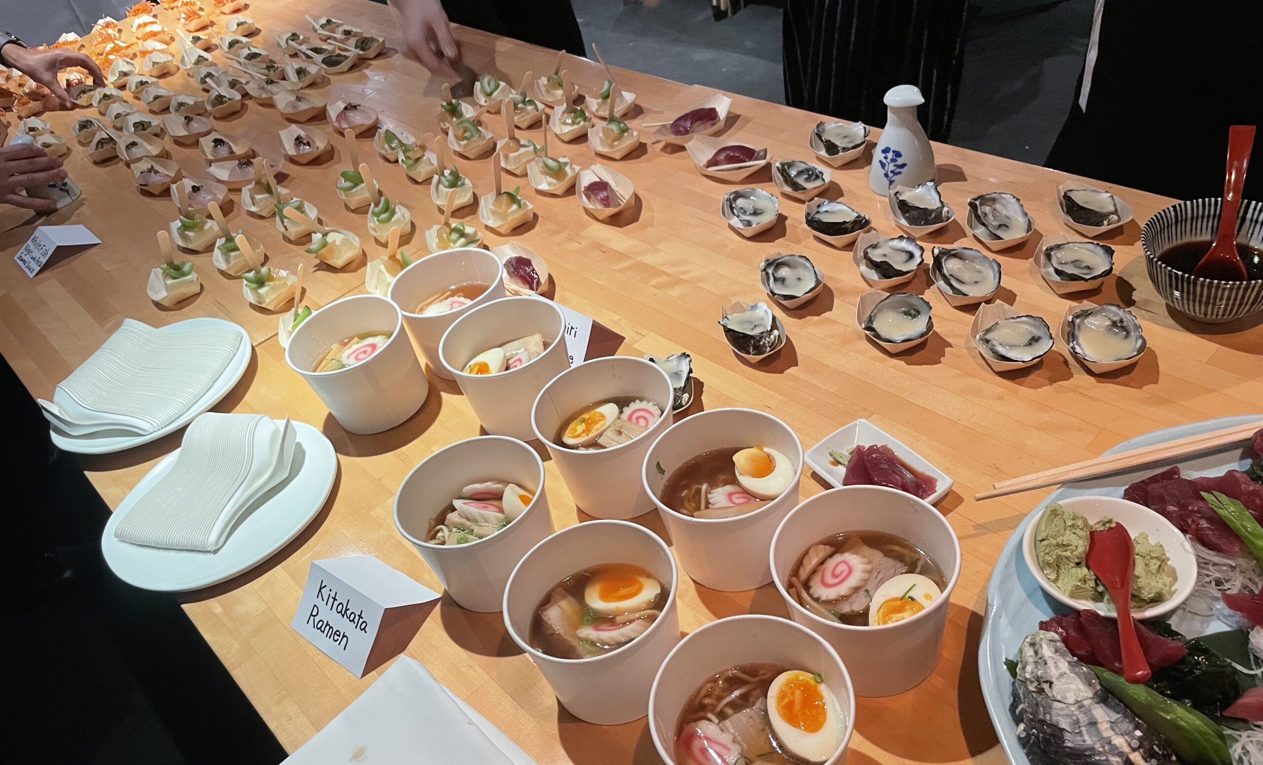 会場では、刺身や寿司に加え、福島の郷土料理「イカニンジン」、喜多方の醤油ラーメン、桃のデザートなども振る舞われ、食と酒の相性を実感できる構成となっていた。