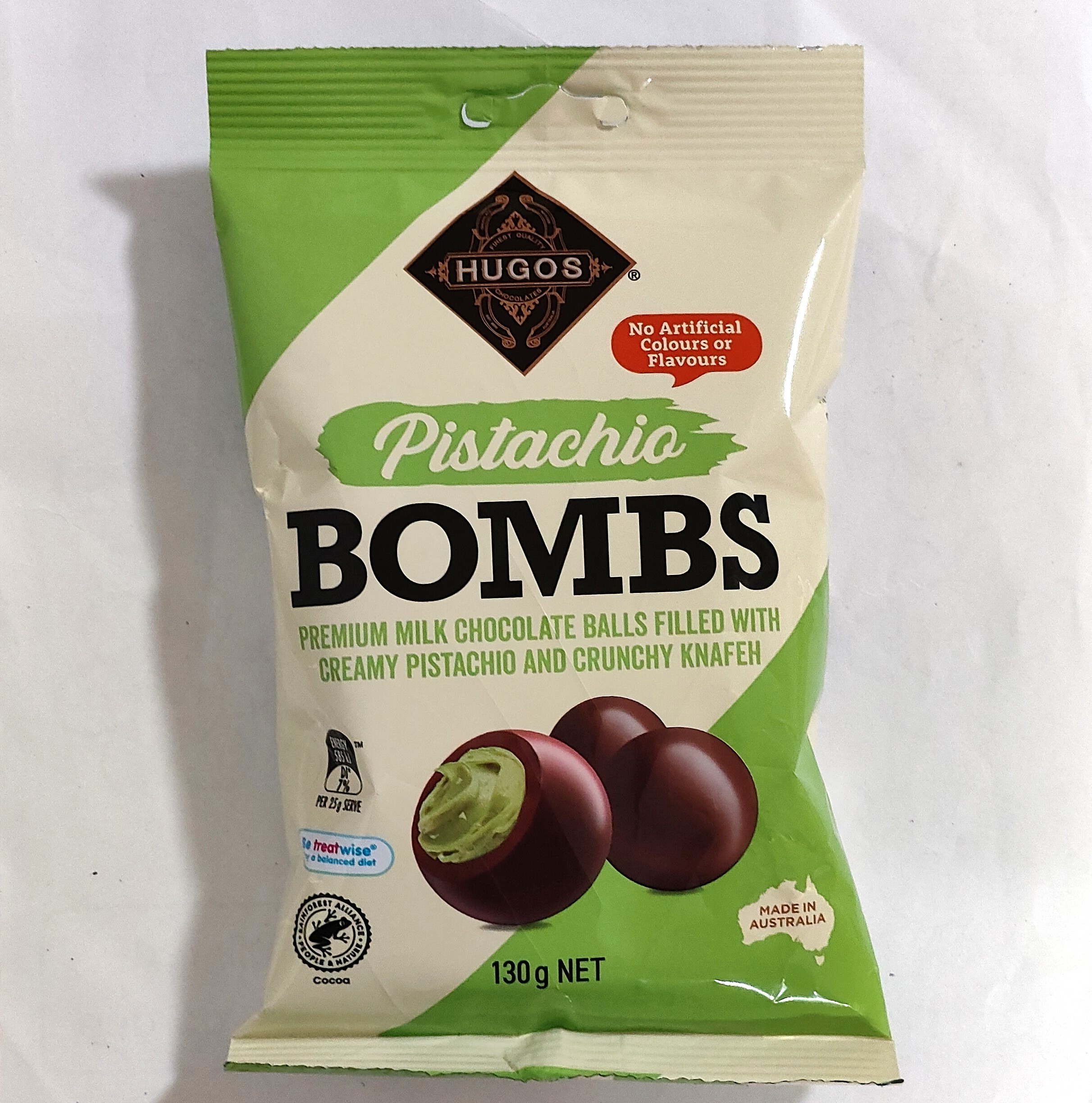 「ピスタチオボムズ」は、ピスタチオと、水と小麦粉から作られる中東のお菓子クナーファが入った円形のチョコレート菓子で「オーストラリア版のドバイチョコレート」とも呼ばれています。甘すぎずサクサクとした食感で、同じシリーズのピスタチオプレッツェルと一緒に食べれば、甘みと塩味が一度に楽しめます。