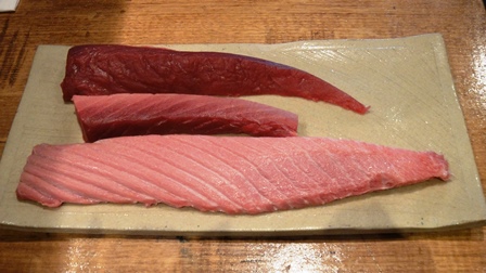 シドニーの回転ずしでもこの時期は、通年提供される赤身だけではなく、中トロや大トロもオーダーできます。オーストラリアで食べられるのは本マグロ(BluefinTuna)、ミナミマグロ(Southern Bluefin Tuna)、メバチマグロ(Bigeye Tuna)、キハダマグロ(YellowfinTuna)などで、シドニー南部アラダラ周辺でとれるとのこと。