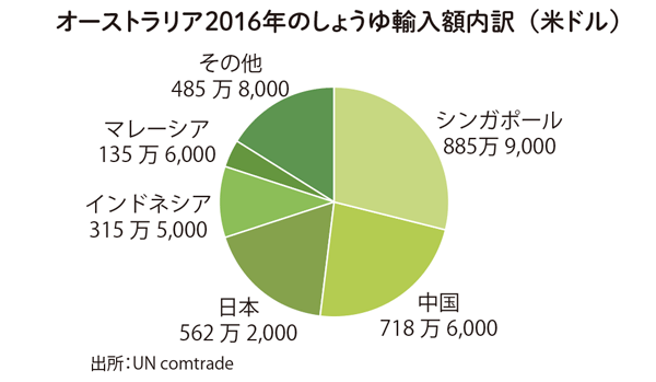 2016年のオーストラリアのしょうゆ輸入相手国は、上位がシンガポールと中国で、この2カ国産の商品が約半分を占め、日本は第3位。ちなみに、オーストラリアではシンガポールで製造されたキッコーマンのしょうゆが流通しており、販売額ベースでしょうゆ市場の約31%を占めています。