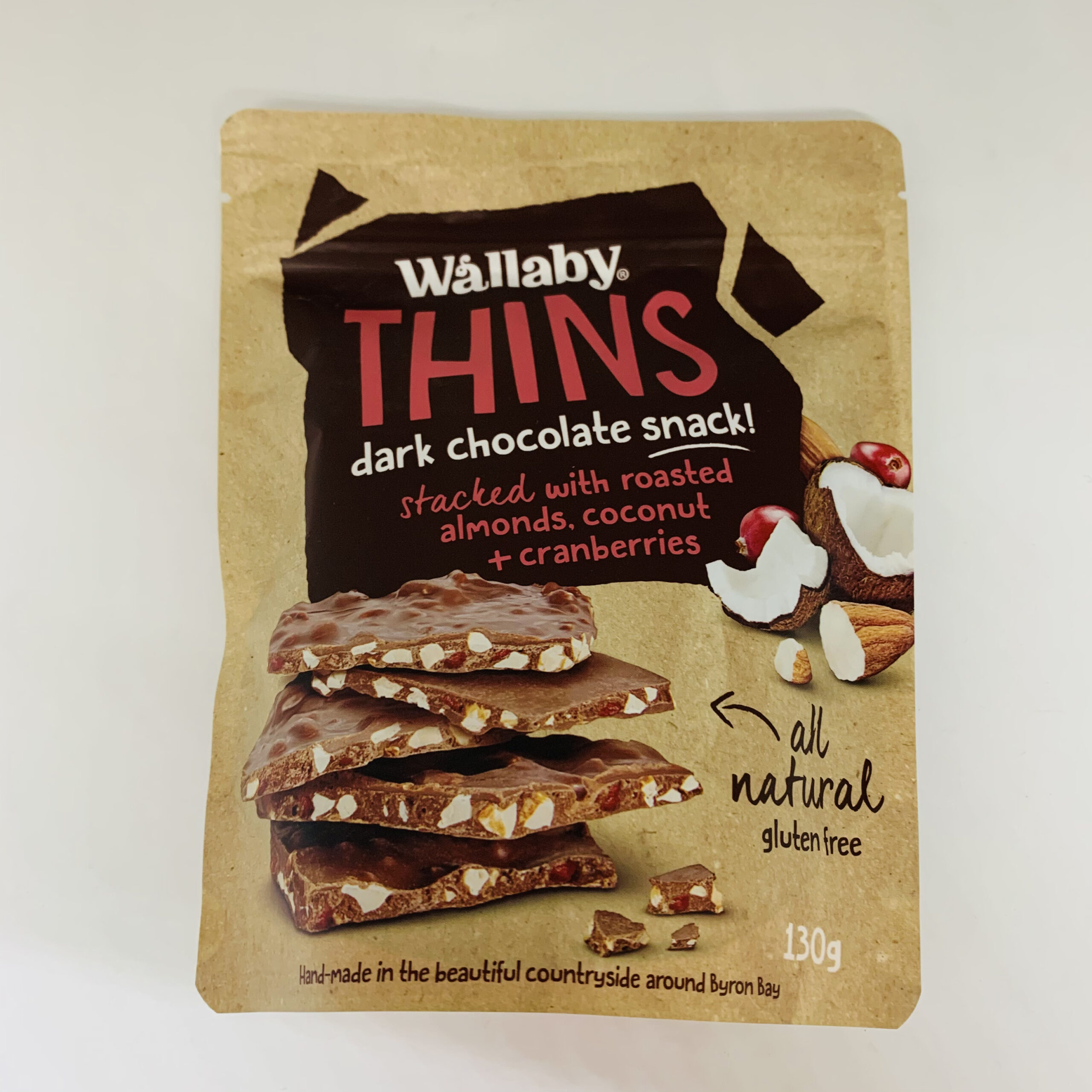 今回ご紹介するのは、オーストラリアのバイロンベイに工場があるチョコレートスナック会社ワラビーのシンズ・ダークチョコレート、アーモンド・ココナッツ・クランベリー味です。ほろ苦いダークチョコに、砕いたアーモンドやココナッツなどが入っています。長方形のずっしりしたチョコレートバーではなく、一口サイズにカットされていて、食べやすい大きさ。大味ないわゆる海外のチョコではなく、繊細で上品な日本のチョコに似た味わいです。また空け口にジップロックがついているので、しっかり保存することができます。