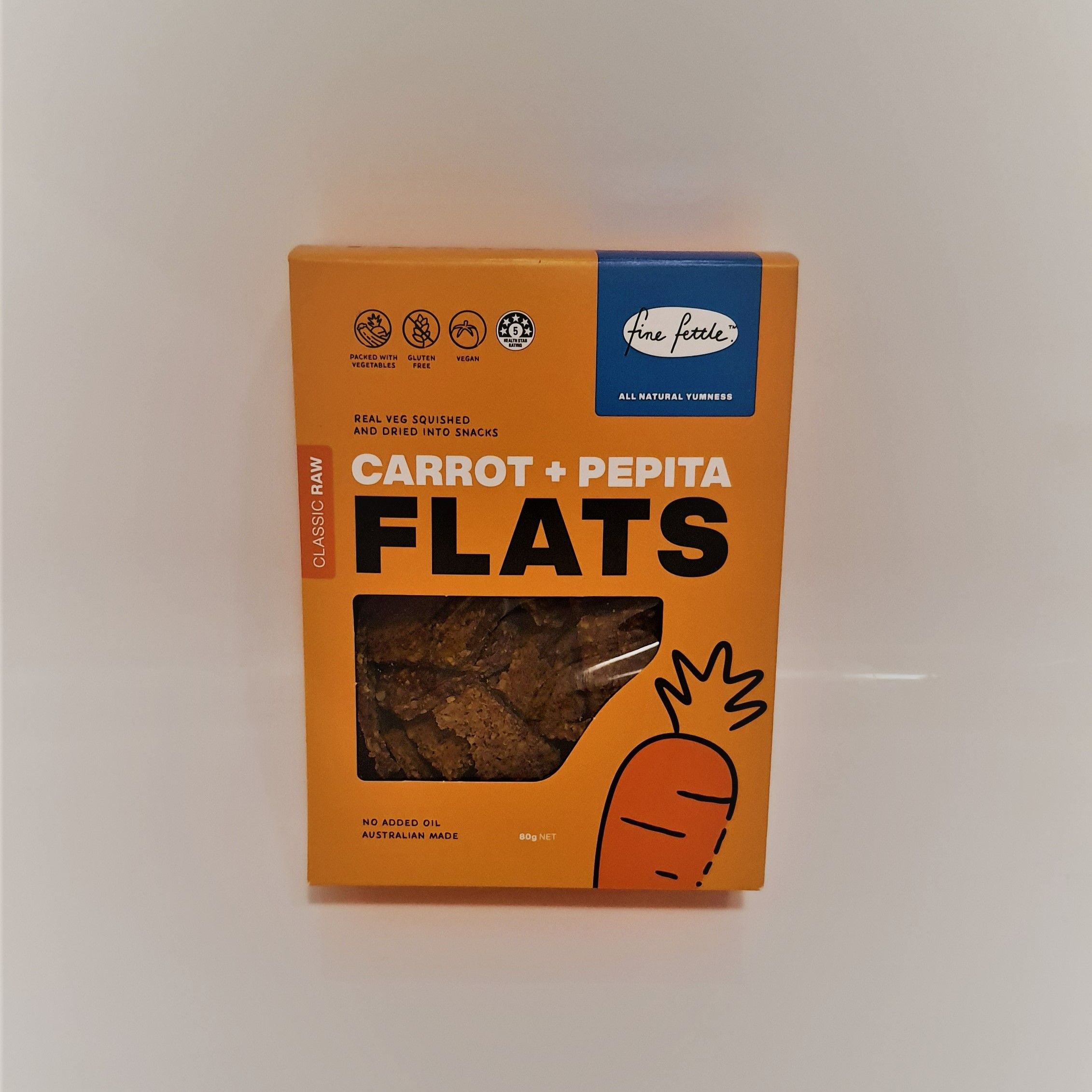 シドニーを拠点に2009年に創業した食品会社ファイン・フェトル・フーズは、本物の野菜を平らに整形して乾燥させ、「フラッツ」の商品名で野菜クラッカーを製造・販売しています。価格は1箱7豪ドル(1豪ドル=約80.7円)で、「リアルフード」を掲げており、オーストラリア産の新鮮な野菜と、油を使わず乾燥させたがセールスポイント。特に、低温で時間をかけて乾燥させることが秘訣で、野菜の栄養を損なわないように注意しているそうです。もちろん、グルテンフリーと保存料無添加は当然のこととして表示されています。