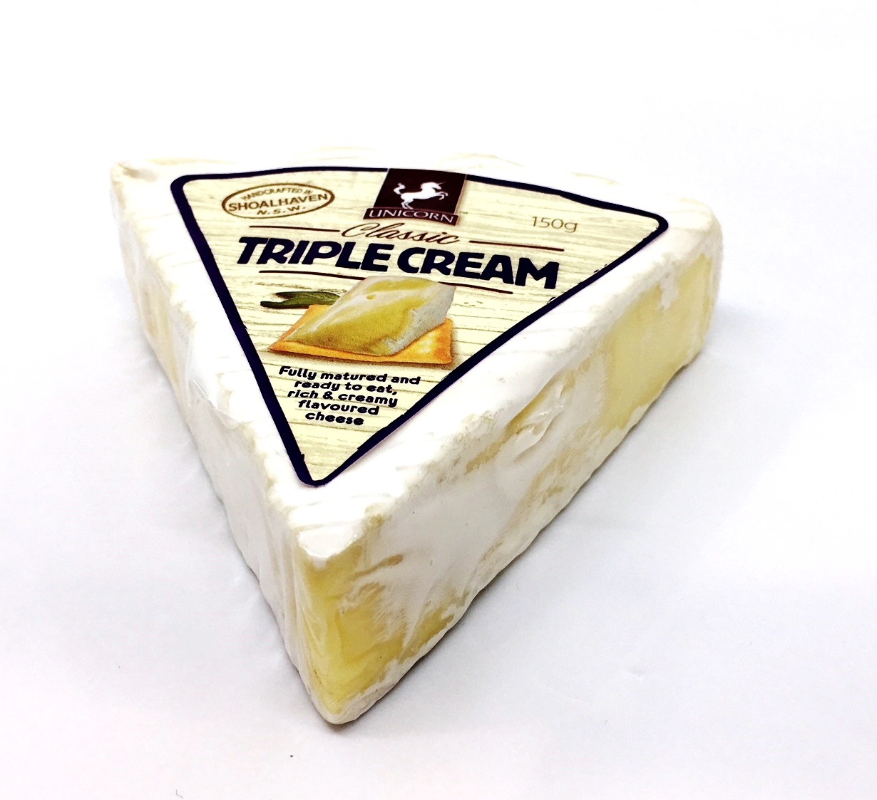 オーストラリアのスーパーではチーズの売り場だけでかなりのスペースが取られていますが、今回はその中から、オーストラリアの老舗ブランド、ユニコーン・ブランドの「トリプル・クリームチーズ(ブリー)」を紹介します。実はユニコーンは、日本の大手乳業メーカー、雪印メグミルク傘下にあるブランドです。