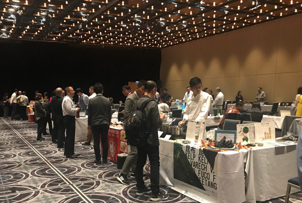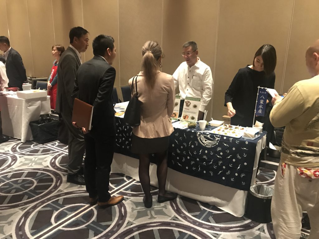 「日本産農水産物・食品輸出商談会2019」に参加したのは、◆丸善納谷商店(昆布、北海道)◆八葉水産(三陸めかぶサラダ胡麻ラー油、宮城)◆三陸コーポレーション(三陸フィッシュソーセージ、宮城)◆男山本店(蒼天伝 純米大吟醸、宮城)◆飛鳥フーズ(酒田港船内凍結するめいか刺身、山形)◆ヤマキ(国産有機玄米味噌、埼玉)◆弓削多醤油(有機しょうゆ、埼玉)◆エスビー食品(S&B GOLDEN CURRY MIX IN FLAKES、東京)◆ショクリュー(天草サクラ鯛、東京)◆三忠(豆腐ハンバーグ、新潟)◆マルマツ(どうまい!!浜松餃子、静岡)◆近江牛輸出振興協同組合(近江牛、滋賀)◆和田萬(有機黒ごまペースト、大阪)◆東亜食品工業(グルテンフリーうどんヌードル、兵庫)◆カネテツデリカフーズ(ほぼカニ、兵庫)◆五條酒造(五神 純米大吟醸、奈良)◆築野食品工業(Rice Bran Oil、和歌山)◆友田セーリング(冷凍スチームボイル紅ズワイ蟹上肉、鳥取)◆マルト製菓(抹茶カステラ、広島)◆タナカショク(豆腐ジャーキー 百三珍、高知)◆太平洋貿易(神籠の眠り、福岡)◆農業生産法人かぐらの里(SHIROMI YUZU SYRUP、宮崎)─の22社。