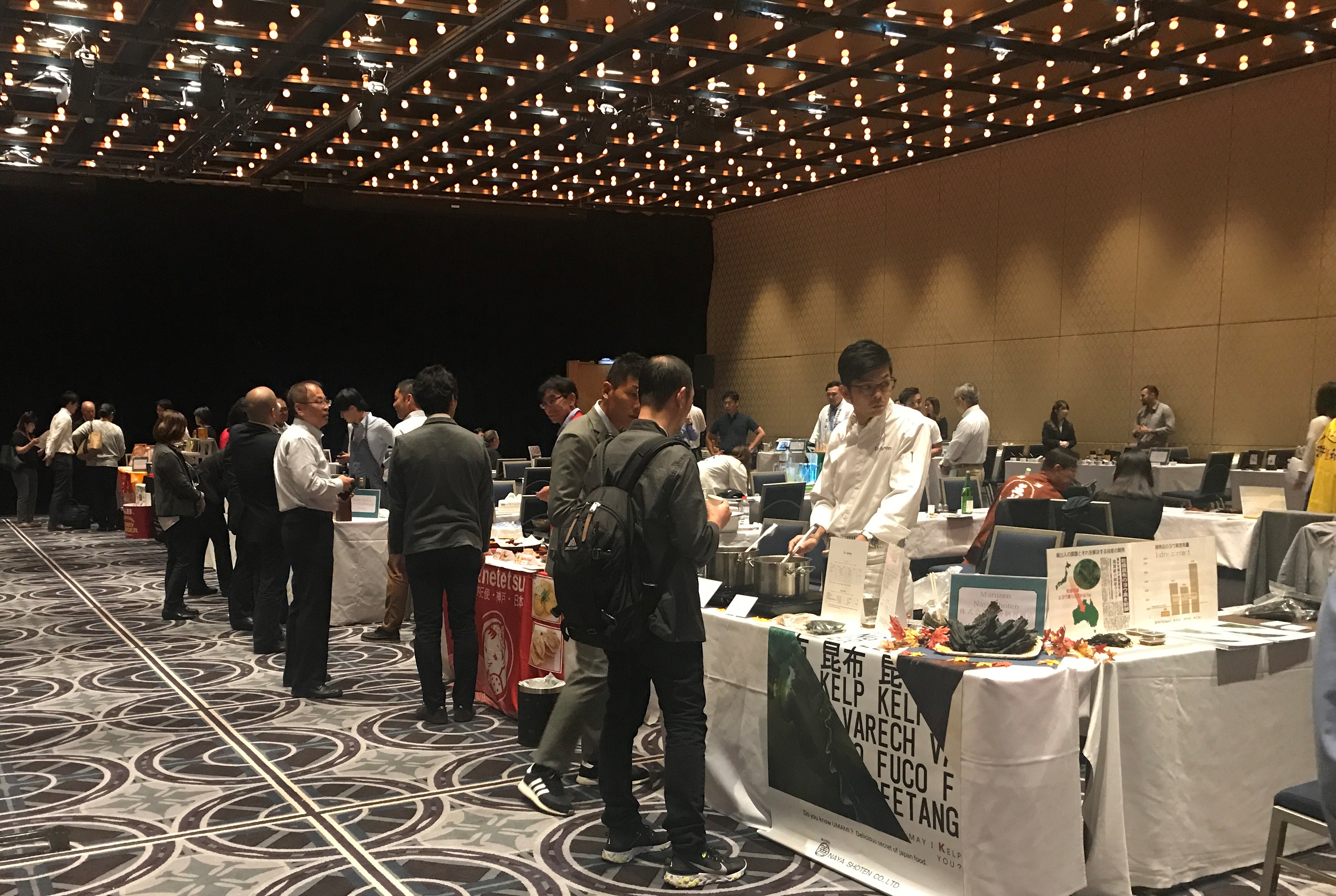 各ブースには、柚子、大豆、昆布などの食材を使った製品や、注目度の高い和牛や日本酒などが並び、参加者は熱心に説明を聞いていた。調理デモンストレーションも実施され、著名シェフの間中弘氏らが商談会に並んだ食材を用い腕を振るった。