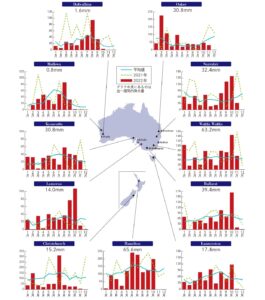 本誌は毎号オーストラリアとニュージーランドの主要農畜産地域の降水量グラフを掲載しています。今週号の19ページをご覧いただくと、ニューサウスウェールズ州とビクトリア州の10月の降水量が、平均を大きく超えていたことが一目瞭然です。