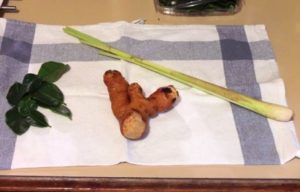 トム・ヤム・ガイのスープに欠かせない材料は3つ。カフィア・ライムの葉、ガランガル(Galangal)、レモングラスで、スーパーマーケットで手に入ります。日本ではこぶみかんの葉と呼ばれるカフィア・ライムの葉は、2つの葉がつながったような不思議な形。葉をちぎると、驚くほどさわやかな柑橘の香りがフワッと広がります。ガランガルはショウガのような形で、スライスすると、甘さと苦さが混ざったような、スパイシーな個性的で深みのある香りがします。レモングラスは日本でもおなじみのハーブですね。日本では乾燥したものがよく売られていましたが、ここでは野菜コーナーなどで売られており、生の状態で使います。この3つの香りが混じると、なんとも言えない、唯一無二の香りが誕生します。キッチンに香りが広がって、ちょっと感動しました。