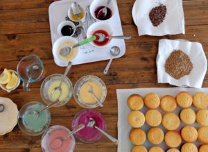 次に、フードカラーを粉砂糖(icing sugar)と混ぜてアイシングを作ります。粉砂糖大さじ5に対しフードカラーを小さじ1/2~1くらいずつ足していき、その都度よく混ぜ、アイシングが好みの固さになるまで調節しましょう。イチゴとブルーベリーのフードカラーは元々とろみがあるので、適宜水を足して好みの粘度にします。黄色のサフランには、水の代わりにレモン汁を少し使って色と風味をマッチさせました。
