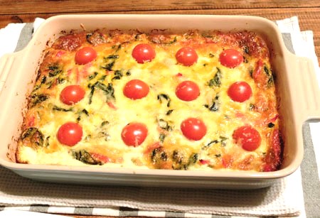 ピーマンやミニトマトと合わせてベジタリアンキッシュにもできますが、コクが必要であればベーコンを加えるとおいしくなります。これからの寒い季節に、野菜たっぷりの温かいスープと合わせて食べたい一品です。