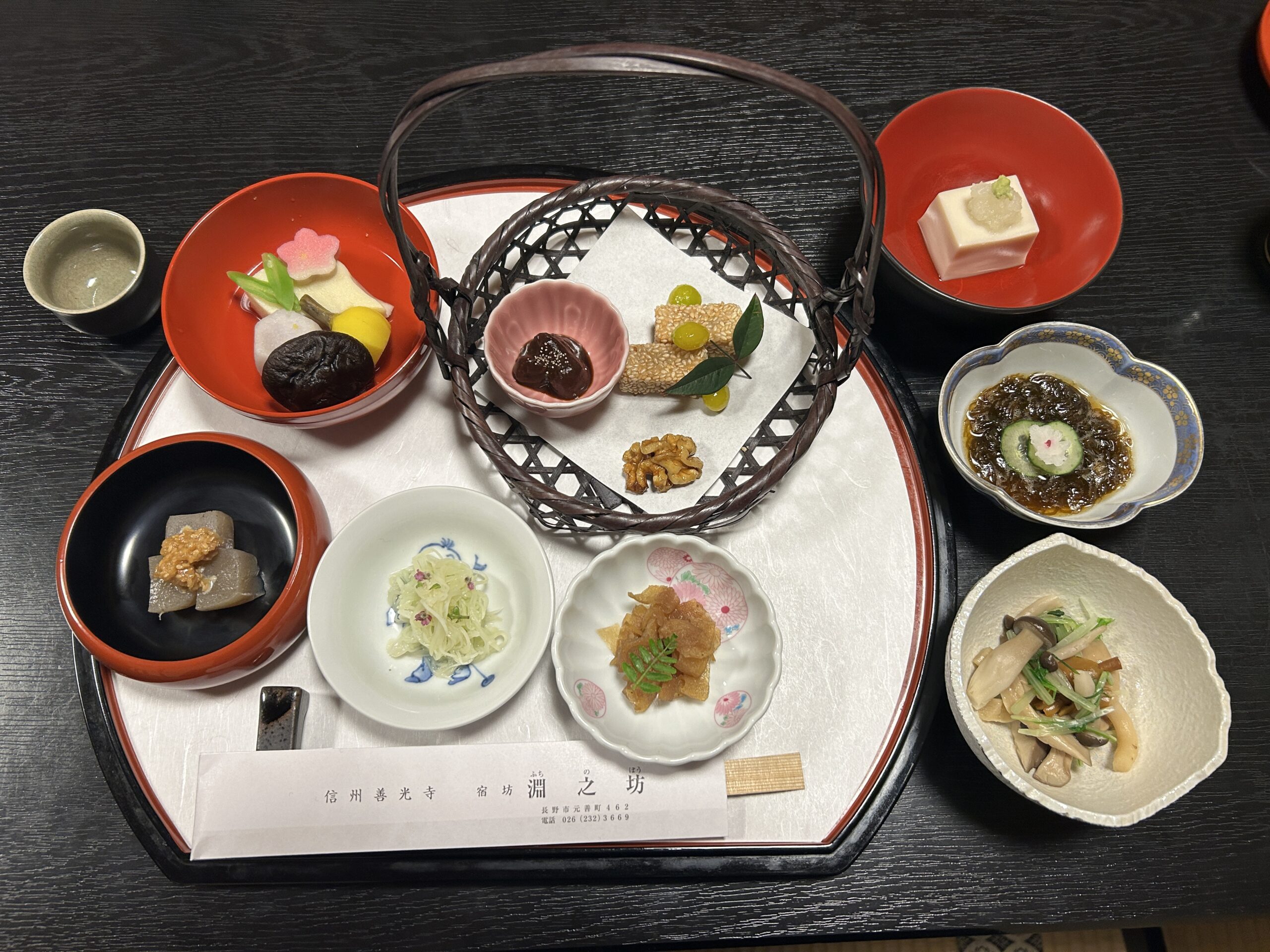 善光寺では、精進料理や護摩祈願、写経といった宗教体験もインバウンド客の関心を集めている。善光寺に39ある宿坊の1つ「淵之坊」では、肉や魚、乳製品を使わない精進料理を提供しており、招聘された記者が宿泊した日もオーストラリアから別グループが滞在していた。海外では環境保護や動物愛護、宗教的理由などから菜食を選ぶ「ビーガン」層が拡大しており、精進料理はこうした層との親和性が高い。評判を聞きつけて海外から宿泊する客も多いという。
