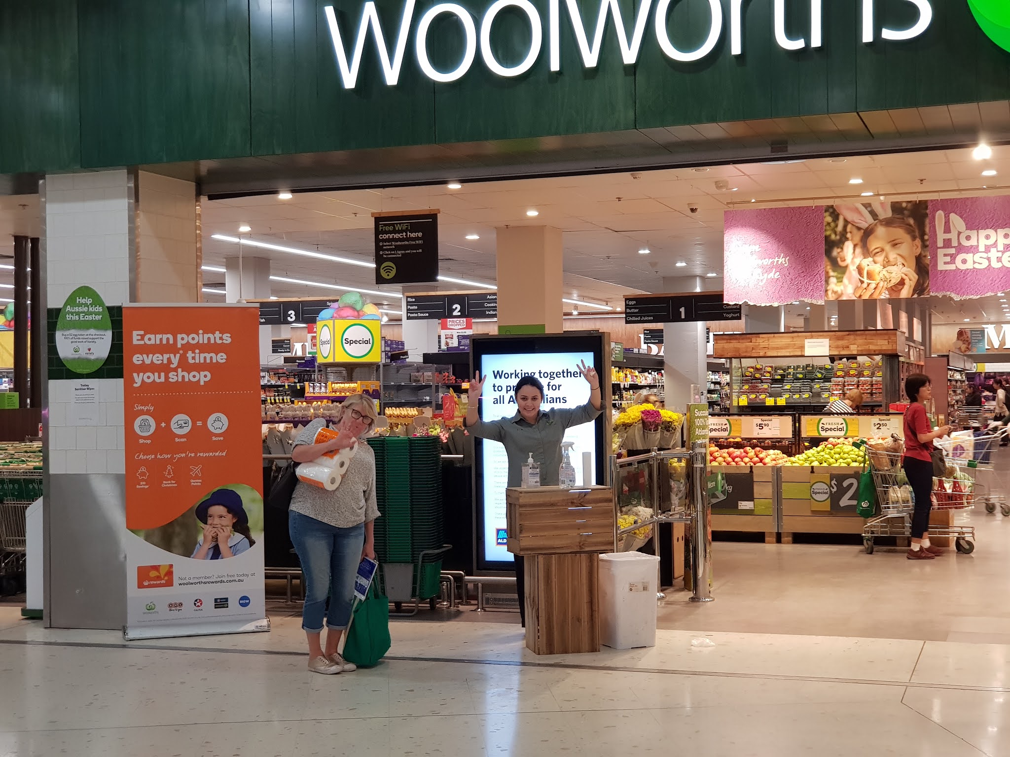 スーパーの店員が入店する顧客に消毒剤を配布(シドニー市内)