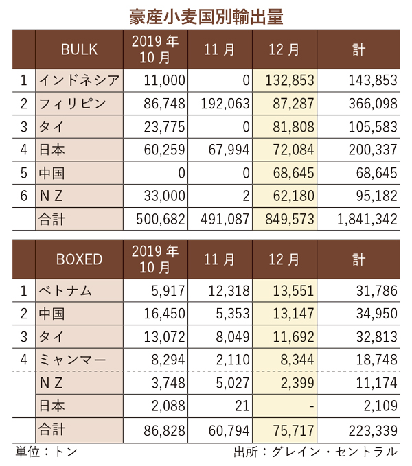 オーストラリアの2019年12月の小麦輸出量は、南オーストラリア州と西オーストラリア州の収穫が輸出可能になり、92万5,290トンに増加、11月の55万1,881トンを68%も上回ったことが分かった。