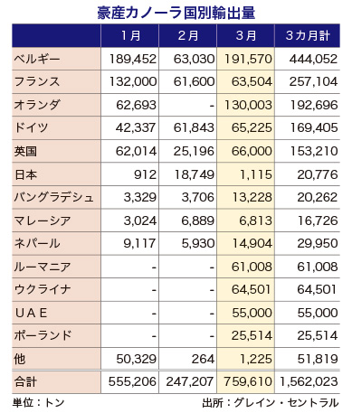 オーストラリアの3月のカノーラの輸出量は75万9,610 トンと、前月の24万トンあまりから3倍以上増加したことが豪政府統計局(ABS)の調べで分かった。