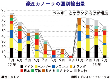 豪2月カノーラ輸出16%減、日本は3位 2023年4月20日 最終更新日時 : 2023年4月20日 ウェルス編集部 オーストラリアの今年2月のカノーラの輸出量が59万7,775トンで、前月の71万3,188トンから16%減少したことが豪政府統計局(ABS)のデータで判明した。日本は第3位の輸出市場だった。前年同月の60万8,557トンもわずかに下回った。グレインセントラルが伝えた。 コンテンツの残りを閲覧するにはログインが必要です。 お願い Log In. あなたは会員ですか ? 会員についてFacebookXBluesky