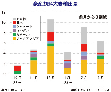 豪3月飼料大麦輸出3割減、ソルガム5倍に 2023年5月25日 最終更新日時 : 2023年5月25日 ウェルス編集部 オーストラリアの2023年3月の飼料大麦の輸出量が63万6,233トンで、前月の91万1,105トンから30%減少したことが豪政府統計局(ABS)の調べで分かった。大麦麦芽(モルト)は14万1,590トンが輸出され、2月の4万1,278トンから3倍以上に増加した。また、今シーズンの新作物の出荷が始まったソルガムは25万5,066トンが輸出され、前月の5万3,117トンから5倍近く増えた。グレイン・セントラルが伝えた。 コンテンツの残りを閲覧するにはログインが必要です。 お願い Log In. あなたは会員ですか ? 会員についてFacebookXBluesky