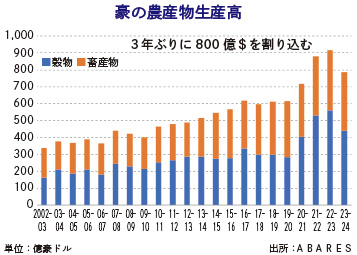 豪の農産物生産高、6年ぶり減少 乾燥と価格下落で 2023年6月8日 最終更新日時 : 2023年6月12日 ウェルス編集部 オーストラリア農業資源経済・科学局(ABARES)は6日、2023/24年度(23年7月―24年6月)の農産物生産高が790億豪ドル(1豪ドル=約91円)で、前年度から14%減少すると予想した。乾燥した気候により穀物の生産量が大幅に減少することと、多くの農産物価格が下落することが要因だ。輸出額も約2割減少する見通し。17/18年度から拡大を続けていたオーストラリアの生産高は、6年ぶりに成長が止まることになる。【ウェルス編集部】 コンテンツの残りを閲覧するにはログインが必要です。 お願い Log In. あなたは会員ですか ? 会員についてFacebookXBluesky