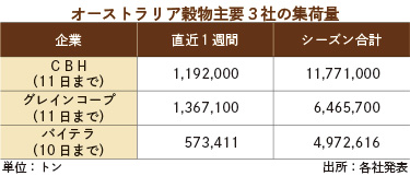 穀物3社の集荷量、2社が前週上回る 2023年12月15日 最終更新日時 : 2023年12月15日 ウェルス編集部 西オーストラリア州最大の穀物業者CBHグループの12月10日までの1週間の穀物集荷量は119万2,000トンと、前週の138万7,000トンを下回った。東部州の同業グレインコープが11日発表した過去1週間の集荷量は136万7,100トンで、前週の30万7,900トンから約4.4倍に増加。南オーストラリア州に拠点を置くバイテラ(Viterra)は10日までの1週間の集荷量が57万3,411トンと、前週の2倍近くに増加した。 コンテンツの残りを閲覧するにはログインが必要です。 お願い Log In. あなたは会員ですか ? 会員についてFacebookXBluesky