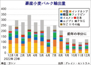 グレインコープが減益予想、輸出も大幅減 2024年2月16日 最終更新日時 : 2024年2月16日 ウェルス編集部 オーストラリア東部州最大の穀物商社グレインコープはこのほど、2023/24年度(23年10月-24年9月)の利益予測について、前年度比で約50%の減益になるとの見通しを明らかにした。東部州の穀物収穫量が大豊作を記録した過去2年間から通常の水準に戻っているためと説明している。14日付グレインセントラルが伝えた。 コンテンツの残りを閲覧するにはログインが必要です。 お願い Log In. あなたは会員ですか ? 会員についてFacebookXBluesky