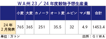 WA州昨季の穀物生産量、前年比で50%減 2024年2月16日 最終更新日時 : 2024年2月16日 ウェルス編集部 西オーストラリア(WA)州の穀物産業協会(GIWA)はこのほど、2023年シーズンの穀物生産の結果を明らかにした。同シーズンのWA州の穀物生産量は計1,450万トンとなり、過去最高を記録した22年と21年に比べて約50%の落ち込みとなった。 コンテンツの残りを閲覧するにはログインが必要です。 お願い Log In. あなたは会員ですか ? 会員についてFacebookXBluesky