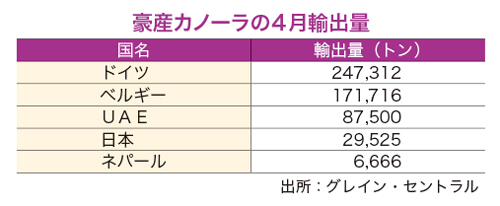 豪政府統計局(ABS)は、4月のオーストラリア産カノーラの輸出量が55万4,503トンと、前月から38%増加したことを明らかにした。