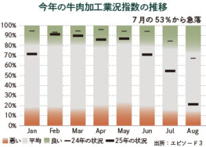 牛肉加工業、畜牛価格上昇で8月に業況悪化