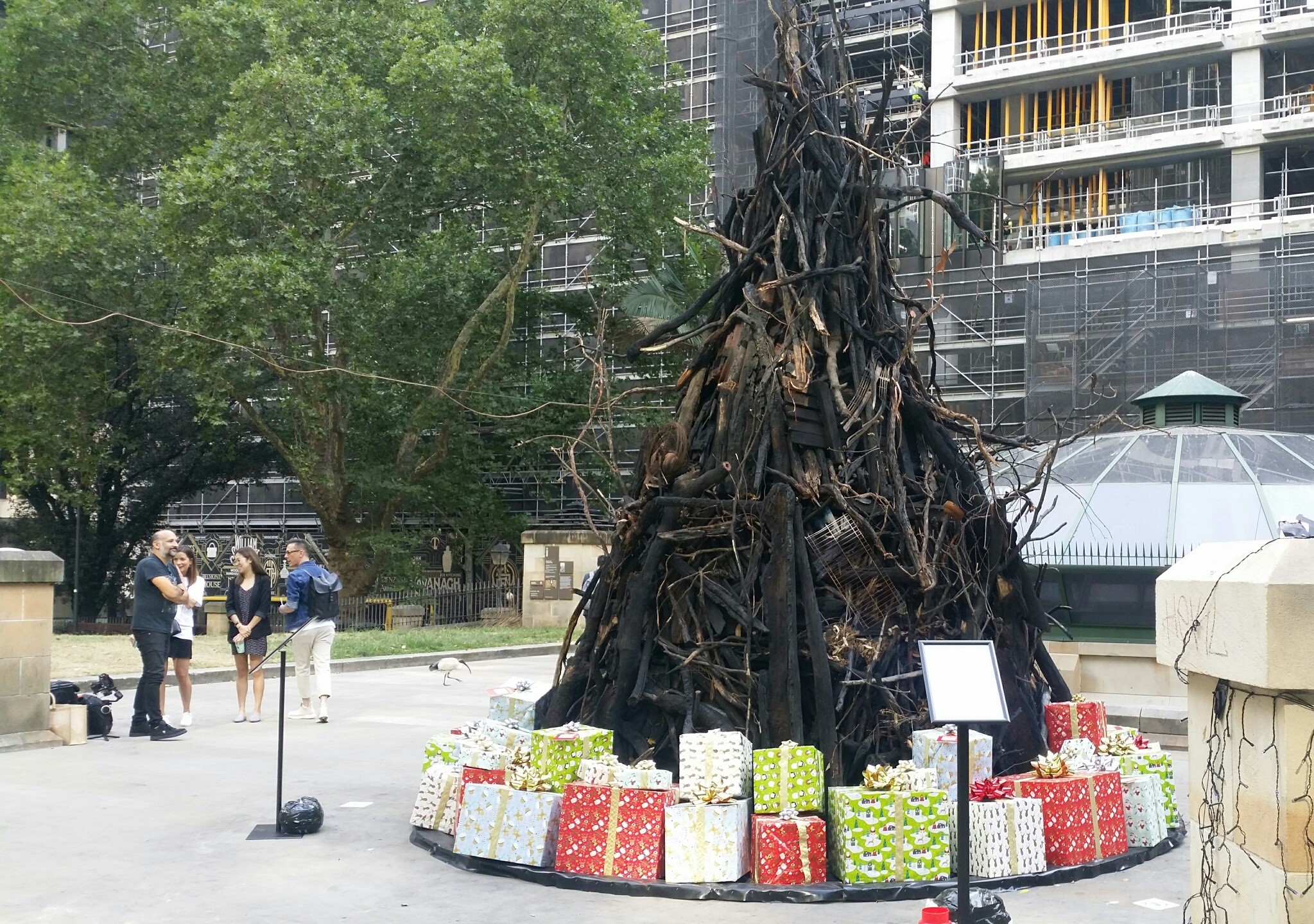 山火事で焦げた木々で組み上げられたクリスマスツリー。被災者支援の募金会場で
