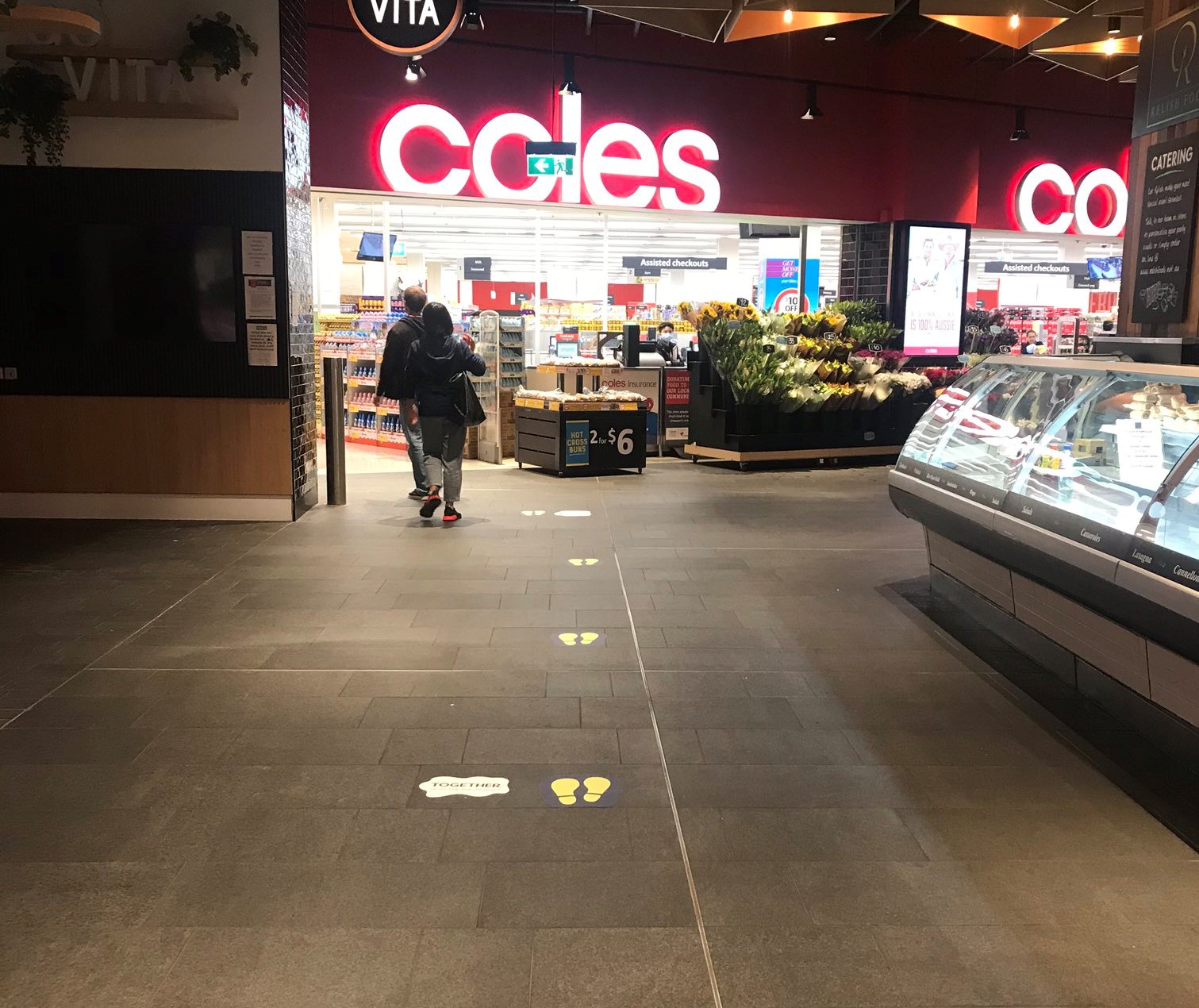 スーパーの入り口には、社会的距離を守って並ぶための目印が印された(シドニー市内)