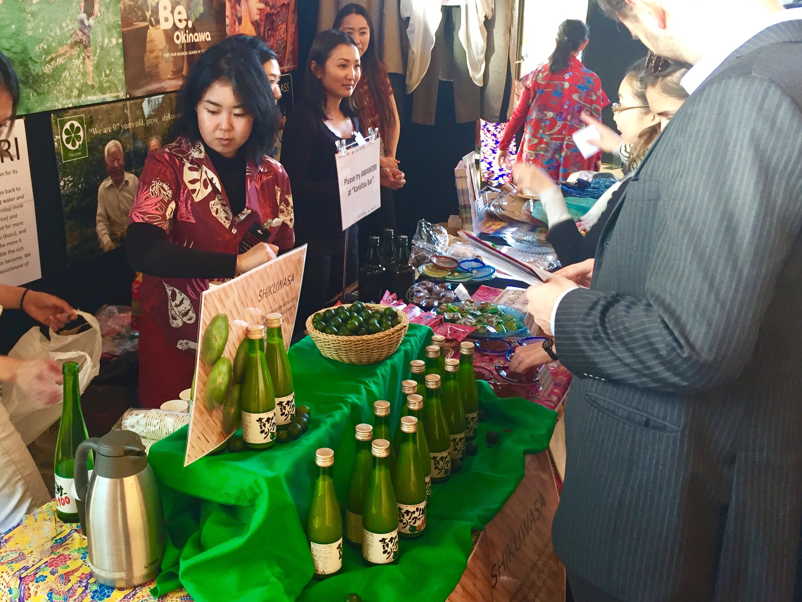 シークワーサージュースや泡盛、琉球グラスなどを紹介する沖縄県のブース