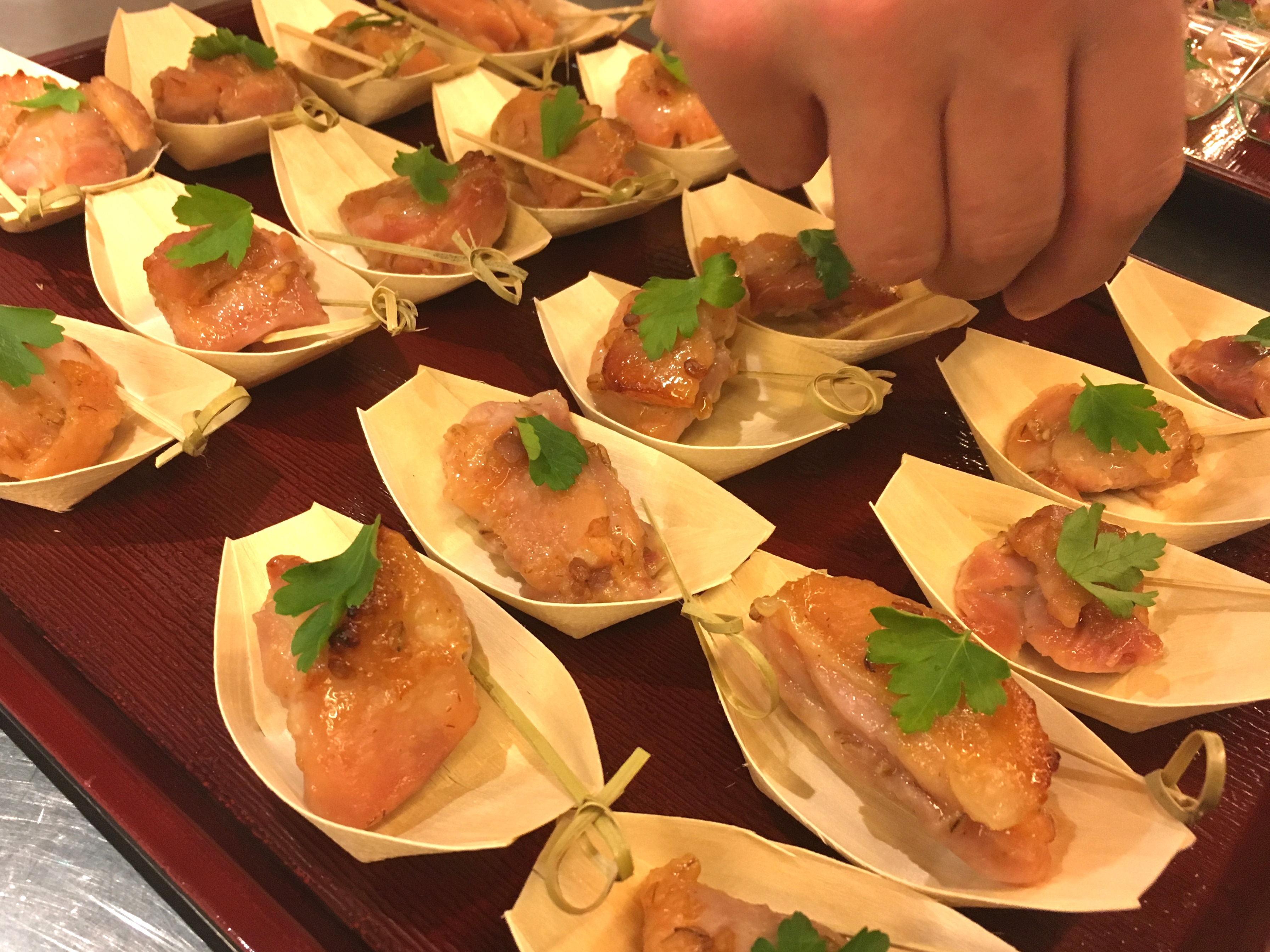 会場には多くの飲食業関係者やメディアが訪れ、愛媛県産のゆずポン酢を使ったハマチのカルパッチョや、麦みそを使った若鶏のみそ漬け焼き、愛媛名物の鯛めしなどが振る舞われた。日本酒は地元産の米を使った八木酒造の「山丹正宗」など愛媛の地酒6種が並んだ。