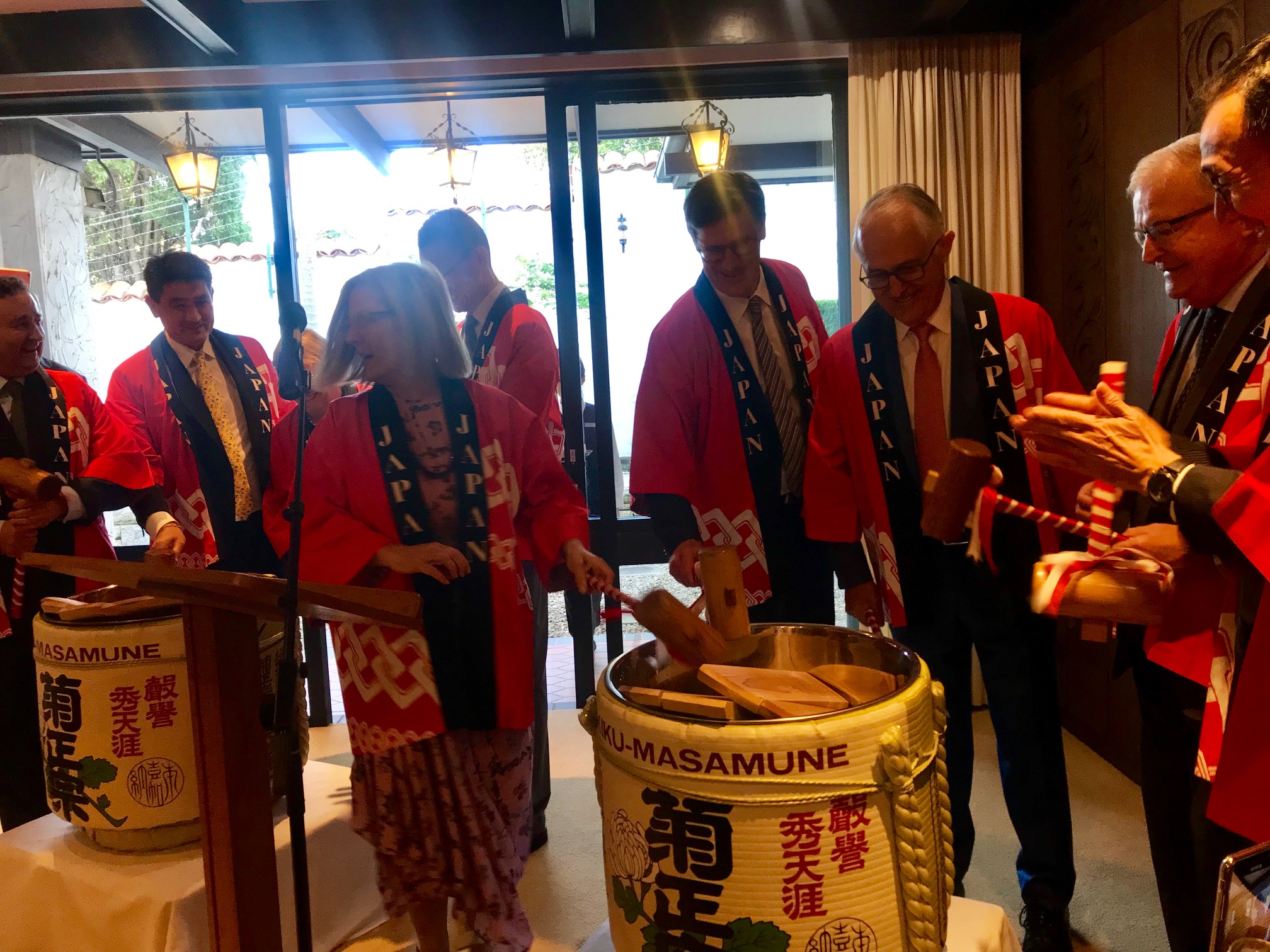 天皇誕生日を祝う年末恒例の祝賀会で、日本酒「菊正宗」が振る舞われた